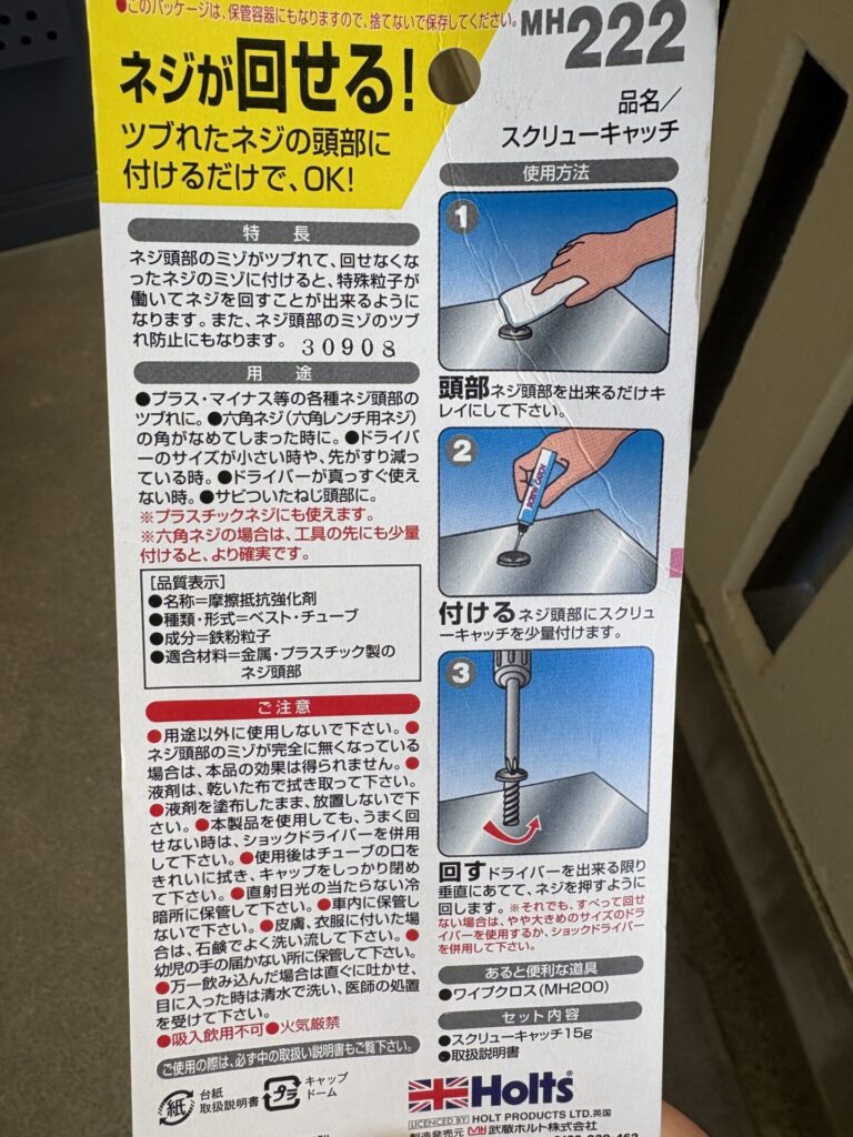 他にもHoltsのスクリューキャッチ(500円程度)こちらも常備していますが、ネジザウルスで解決が付いている為、使用した事はありせん。