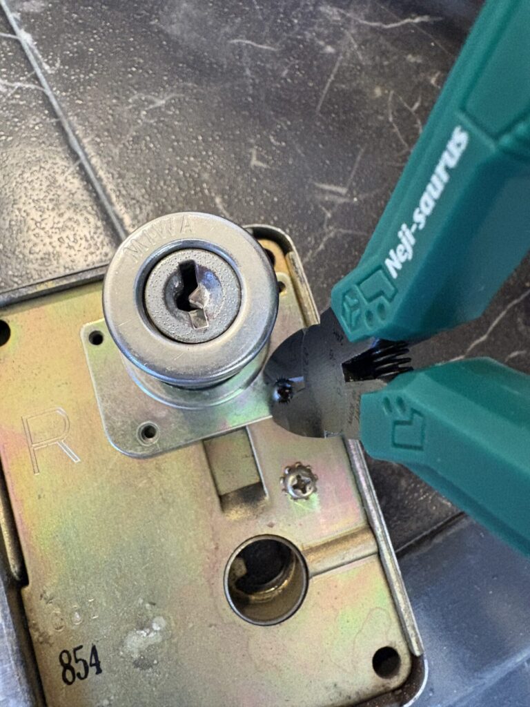 古いネジが何度も使いまわされているとネジやまが潰れたり、舐めてしまっていたりでネジが回らずシリンダーを取り出す事が出来ません。